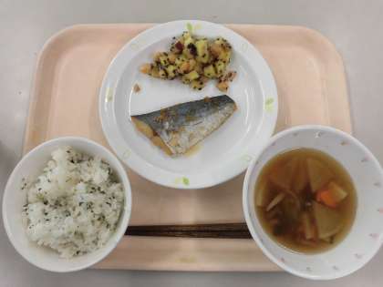 今日の給食は「まごわやさしい」献立です。この言葉は昔からよく食べられてきた食べもの(まめ、ごま、わかめ、やさい、さかな、しいたけ、いも)の頭文字を覚えやすく並べたもので、健康な食生活を送るために取り入れたい食材です。今日はこれらの食材をすべて使用して作りました。