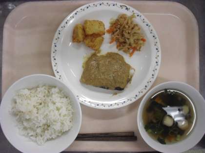 <ごはん(麦入り)・さばのごまだれかけ・はりはりサラダ・チーズはんぺん・すまし汁・牛乳>