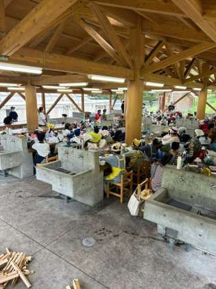 飯盒炊さんを始めます。学年の子どもたちが全員入っても余裕のある大きな炊事場です。まずは安全な調理や片付けなどを習っています。