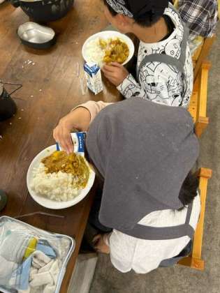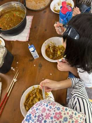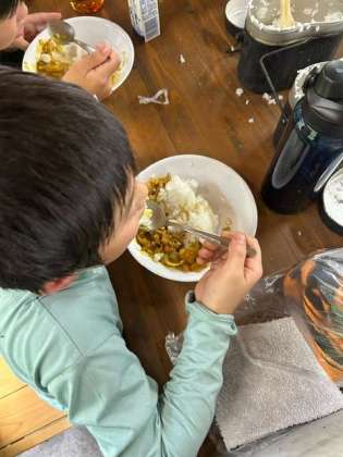 時間をかけて、目に涙して玉ねぎをむいて、みんなで作ったカレーライス。美味しいに決まってます。他に代えられない思い出に残る体験になったと思います。とっても美味しそうに食べています。