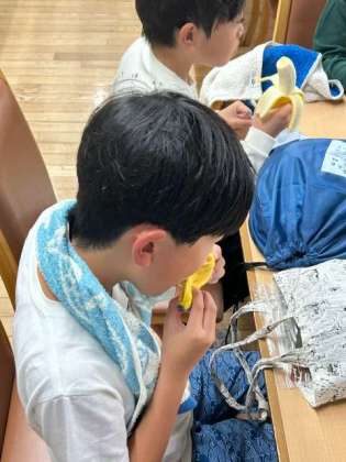 キャンプファイヤーの後はお風呂に入りました。ふじやまビレジのお風呂は温泉です。気持ちよく入っています。その後にバナナを食べました。本日のホームページでのご報告は以上です。