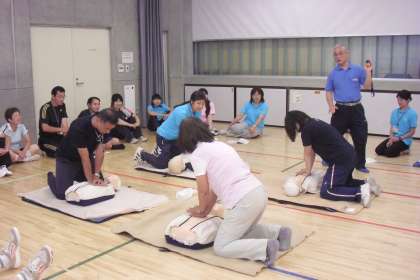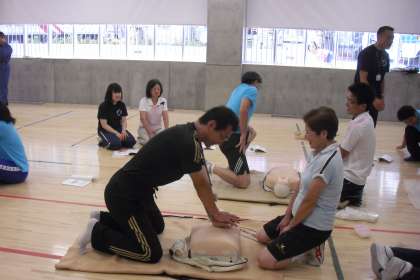 東京消防庁世田谷消防署の方に来ていただき、心臓マッサージの方法やAED装置の取り扱い方法について学びました。