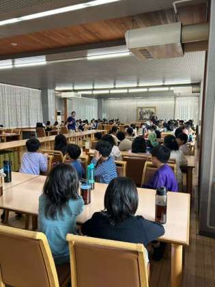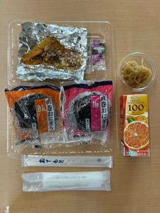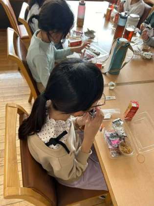 2日目の昼食です。おにぎり弁当。ハイキングから帰って広場で食べる予定でしたが、日差しが強くなってきたので、食堂で食べています。