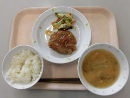 今月は読書月間です。給食の献立にも図書館の本に出てくる料理を取り入れました。早速今日の『ハンバーグ』はコラボメニューです。「あしなが」という本より、本に登場する犬のあしながが、仲間の犬にふるまう料理として『ハンバーグ』が出てきます。給食は醤油ベースのたれをかけた『和風ハンバーグ』を作りました。