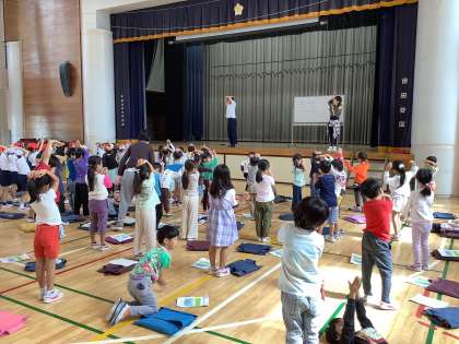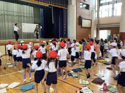 ポーズゲームでフライパンや歯ブラシに変身したり、実際に劇の台詞を言ったりしました。「おなかへっちゃった〜」という台詞を言いながら、大きく表現するコツを聞いてやってみると、体育館中に声が広がり、1年生全員がわがままなおたまじゃくしになりきっていました。これから始まる劇の練習にいかしていきたいです。