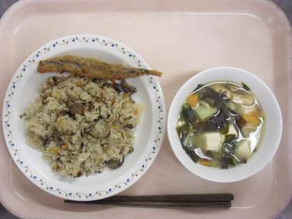 <豚肉とごぼうのごはん・ししゃものフライ・味噌汁・牛乳>