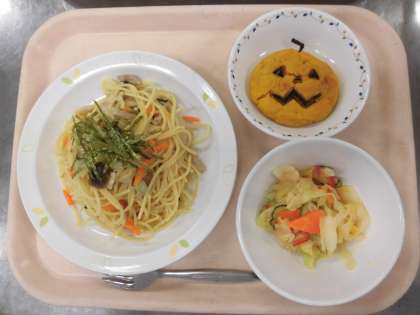 今月実施してきた図書館とのコラボメニューも最終日となりました。今日は「ぐりとぐらとすみれちゃん」、「くふうが楽しい!いろいろ焼き菓子」という本の紹介です。本には「かぼちゃ」を使った料理やお菓子の作り方がのっていますが、給食では「かぼちゃ」を使ったデザートを作りました。サンプルだけ、かぼちゃのお化けに変身しています。