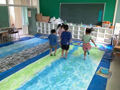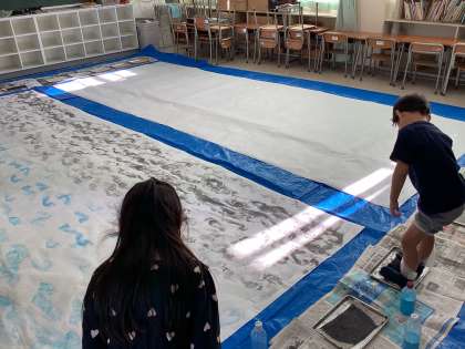 学習発表会では、「おたまじゃくしの101ちゃん」の劇をします。先日、図画工作科の時間に背景作りをしました。履き古した靴下を使い、足の裏に絵の具をつけて、真っ白な紙の上を歩きました。ペタンペタンと歩くたびに自分の足跡がつくことから、「わぁ、楽しい!」との声が聴こえてきました。力を合わせて大きな一つの作品が完成し、演じる意欲もますます高まっています。