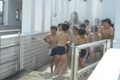 照りつける太陽の下、気温29度、水温25度の中、水しぶきを心地よく感じる時間となりました。それでも、シャワーは冷たく感じたようです。