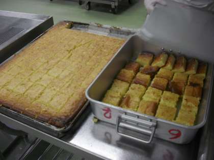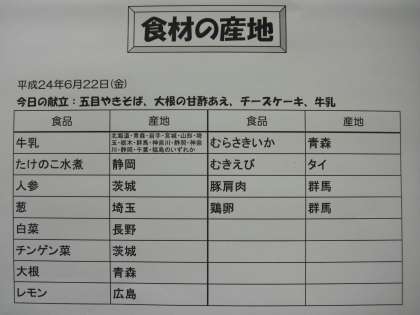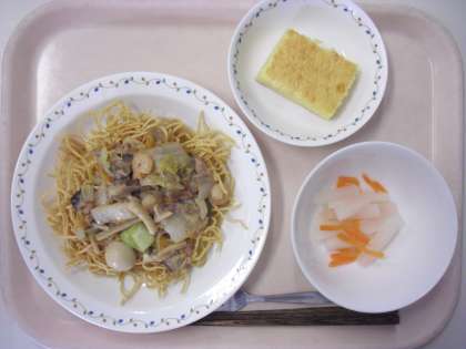 今日の五目焼きそばは、揚げ麺に五目あんかけをかけた焼きそばでした。五目あんかけは、「豚肉・いか・えび・干し椎茸・人参・いか・えび・チンゲン菜・うずら卵」が入っていました。揚げ麺は生中華麺を給食室で揚げています。昨日今日と6年2組のランチルームがありました。今日のケーキはレモン風味がきいたふわふわしてしっとりとしたチーズケーキでした。