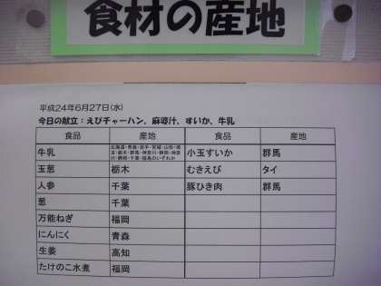 麻婆汁は、麻婆豆腐があっさりと汁になったようなおいしい汁物でした。すいかは夏の代表的な果物の一つです。すいかは漢字で「西瓜」と書くように、本来ウリ科の野菜ですが一般的には果物類に含まれます。主成分は炭水化物で、カロテンも多く含まれています。すいかは「水分が89.6%・炭水化物が9.5%」であるため、夏のよい水分補給として食されています。