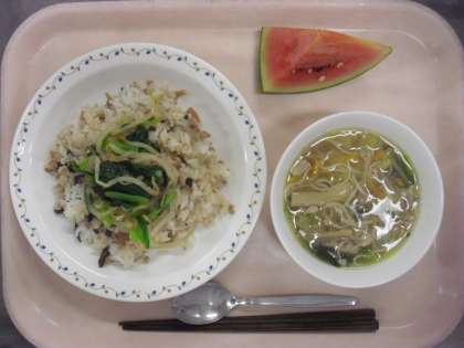 今日の中華スープにはそうめんが入っていました。ビビンバにはナムルをのせておいしくいただきました。夏の果物であるすいかも甘くておいしいすいかでした。