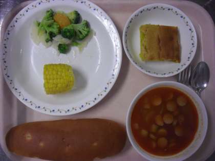 <パインパン・ミネストローネ・ゆでとうもろこし・ブロッコリーのサラダ・かぼちゃのケーキ・牛乳>
