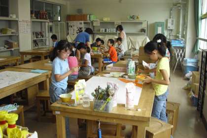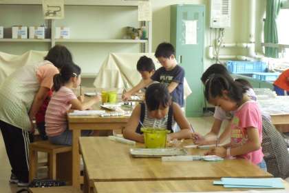 3年生以上の希望児童が参加していますので、学年を超えて教え合う姿も見られます。 できあがったポスターは、世田谷線に掲示されます。