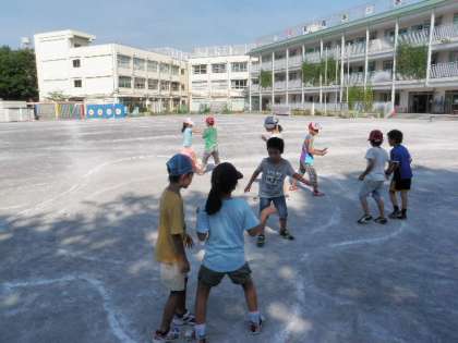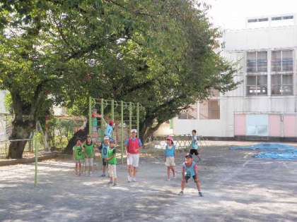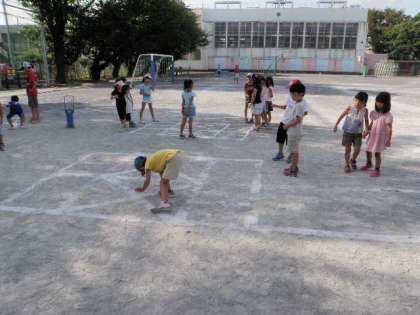 私が小学生時代に遊んだ遊びを紹介しました。2学期に備えて7時15分から8時30分まで遊びました。どの子も汗びっしょりになりながら、しっかり遊んでいました。写真の遊びは、「ケンパー」「ひまわり」「ゾウ・ライオン・ネズミ」です。