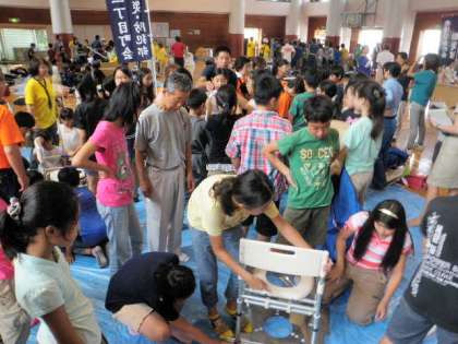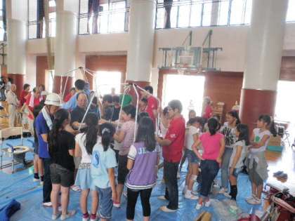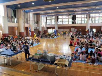 3校時から、5・6年生180人も参加しました。防災倉庫、マンホールトイレ、炊き出し場所を確認しながら、体育館に集まりました。体育館では、子どもたちが実際にマンホールトイレの組み立てをしてみました。