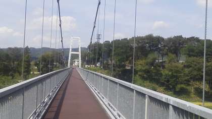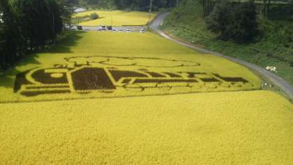 SL広場に乗車した後、吊り橋を渡って田園プラザへ向かいました。途中、橋の上から田んぼを使ったアートが見られました。