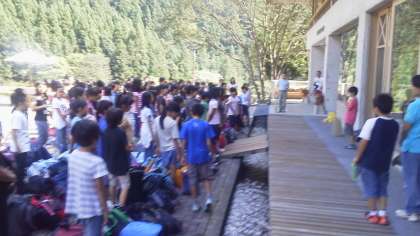 13:30から開室式を行いました。いよいよ川場村での生活が始まりました。開室式後、卒業アルバム用の全体写真を撮りました。少し休んだ後、次は、飯盒炊さんです。