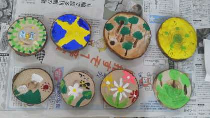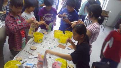 13畤からは、工房でコースター作りです。原材料を紙やすりですべすべなるまで研いて、絵の具で絵を描きました。