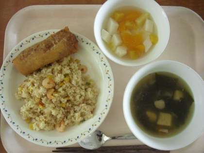<ナシゴレン・春巻き・わかめスープ・フルーツ杏仁・牛乳>
