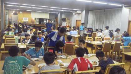 コースター作りの後は、たっぶり自由時間がありました。子どもたちの「後○時間遊べるぞ!」の声が響いていました。写真は、夕食の様子です。この後は、あいにくの雨のため、村の会堂で室内レクを行います。