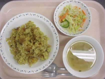 <カレーピラフ・ポテト入りフレンチサラダ・コンソメスープ・牛乳>