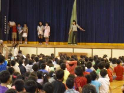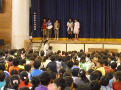 始業前の児童集会は、アナウンスされた教員の声を聞いて、その声は誰か3択で手を挙げて答えるというクイズ形式のものでした。