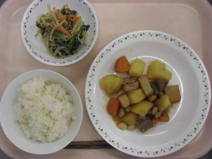 10月の給食のめあては、「食品の働きを知り、バランスよく食べよう」です。今日の献立は、根菜・葉菜・いも類・豆など色々な種類の食品を使っています。今日の赤の食品群は、「大豆・鶏むね肉・さつま揚げ・牛乳」です。赤の食品群は、主にたんぱく質を多く含み、血や肉を作る大切な栄養素です。