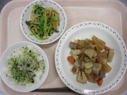 <ごはん(麦入り)・ふりかけ・豚肉と大根のうま煮・おひたし・牛乳>