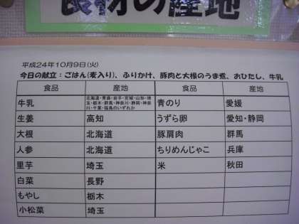 今日の主食は「ごはん(麦入り)」、主菜は「豚肉と大根のうま煮」、副菜は「おひたし」です。主菜の「豚肉と大根のうま煮」には、赤の食品に属する「豚肉・うずら卵」と、黄の食品に属する「こんにゃく・里芋」、緑の食品に属する「大根・人参・白菜」が含まれています。