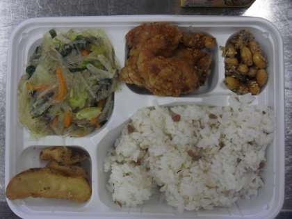 <梅ごはん・鶏の竜田揚げ・フライドポテト・春雨入り野菜炒め・大豆とじゃこの甘辛あげ・みかんジュース>