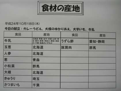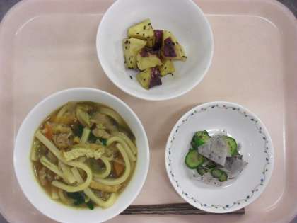 <カレーうどん・大根のゆかりあえ・大学いも・牛乳>