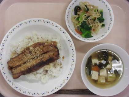 <ごはん・さんまの蒲焼き風・野菜のからしじょうゆあえ・すまし汁・牛乳>
