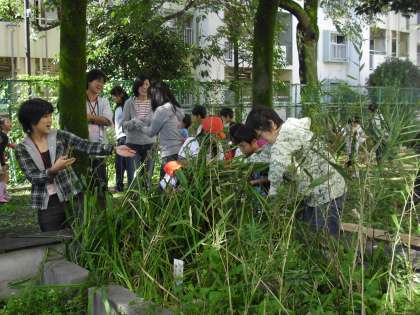 1年生は、担任の先生に連れられ、ボランティアの方に「よろしくお願いします」とあいさつをした後、ビオトープの中の生き物を思い思いに観察しました。