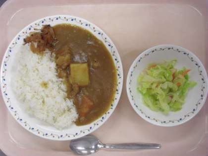 今日は、みんなの好きなカレーライスでした。世田谷区の献立では、毎月1回カレーライスが登場します。甘みの隠し味としてりんごやフルーツチャツネが使われています。