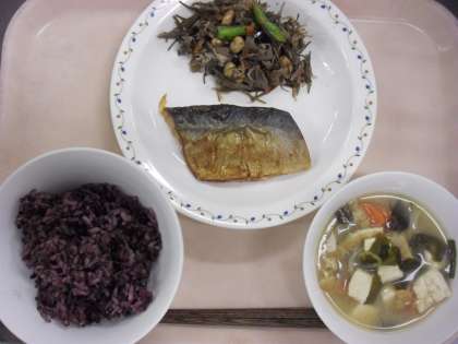 <黒米ごはん・さばの塩焼き・きざみ昆布の五目煮・みそ汁>