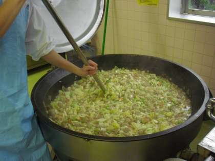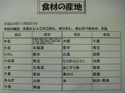つみれ汁の「つみれ」とは、魚のすり身を団子にしたものです。今日のつみれは、鳥取県産であじのすり身を使っています。あじは、青魚で良質のたんぱく質をもっています。また、DHA・IPAといった体によい働きをする脂ももっています。あじの味をよく味わって食べましょう。