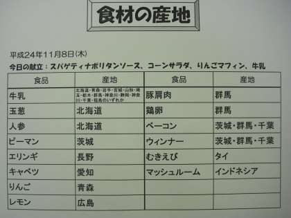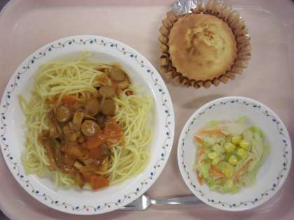 <スパゲティナポリタンソース・コーンサラダ・りんごマフィン・牛乳>