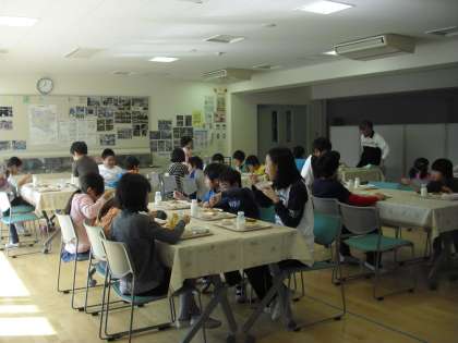 今日明日は、3年2組がランチルームで給食を食べます。ランチルームのデザートであるりんごマフィンは、外側がパリッと内側がしっとりしていて、おいしくいただきました。