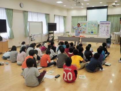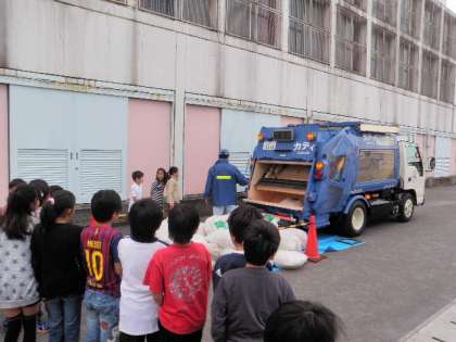 1・2校時、世田谷清掃事務所の皆さんが来てくださり、組ごとに多目的室と校庭に分かれ、廃棄物の処理について学習しました。多目的室では、ごみの処理について学びました。校庭では、清掃車の仕組みを学び、子どもたち一人一人が実際にごみを清掃車に投げ入れ、ごみがどのように清掃車にて収まるかを見ました。