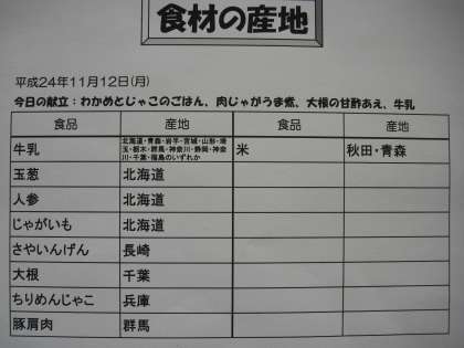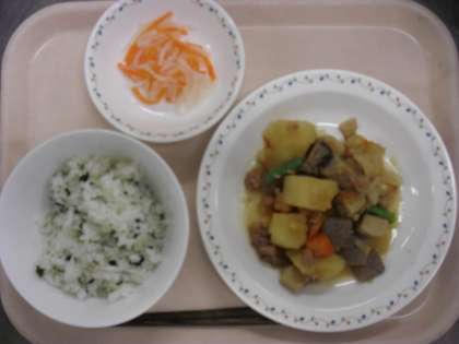 今日の主食は、子どもたちが比較的よく食べる「わかめとじゃこのごはん」でした。肉じゃがうま煮には、「豚肉・じゃがいも・凍り豆腐(高野豆腐)・こんにゃく・人参・玉葱・干し椎茸・さやいんげん」が入っていました。