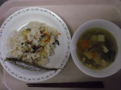<秋の香りごはん・焼きししゃも・吉野汁・牛乳>