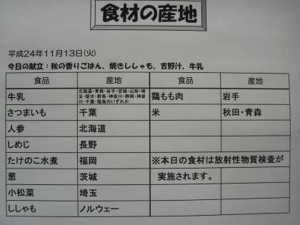 今日の秋の香りごはんは、「栗・さつまいも・しめじ・油揚げ・人参・干し椎茸」が入っていました。さつまいもの甘みが引き立ち、栗としめじが秋を感じさせるご飯でした。今日使用した食材は、放射性物質検査が行われました。検査結果は、近日中に世田谷区HPにて更新されます。