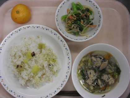★ふれあい給食3-2 <さつまいもごはん・白菜と肉団子のスープ・野菜のごまだれかけ・みかん・牛乳>
