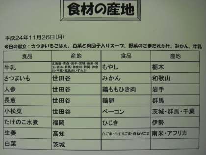 今週は3年生児童の祖父母の方をお招きするふれあい給食が行われます。昔の給食の話をしてくださり、「今の給食はとてもおいしい。また、歌声もすばらしかった」という感想をいただきました。子供たち共々、来てくださった祖父母の方たちも和やかに楽しんでいただけたようでよかったです。今日の世田谷野菜は、「さつまいも・葱・人参・小松菜」でした。