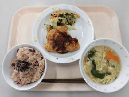 今日の給食でお赤飯を炊いた理由は、明後日17日が赤堤小学校の開校記念日だからです。お祝いメニューとして、赤飯やチキンカツにしました。