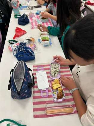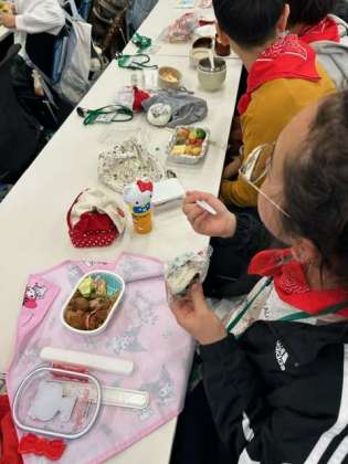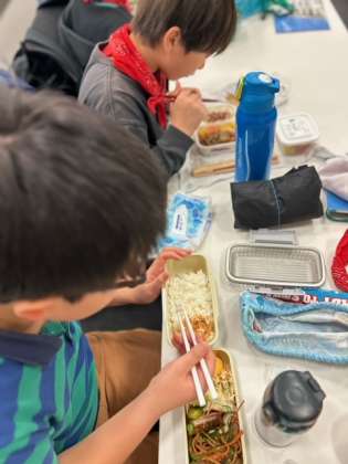 昼食の時間です。今日が小学校最後のお弁当。とても美味しそうに食べています。