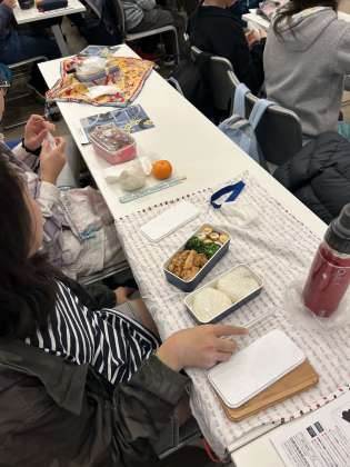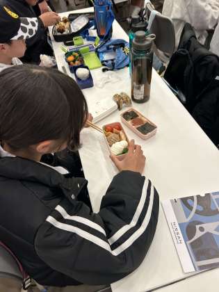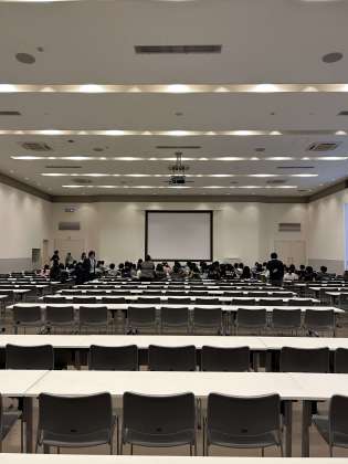 300人以上入る大きなホールで、まずはお弁当をおいしそうに食べています。