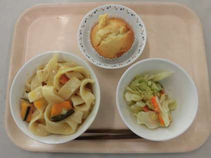 明日は冬至です。そこで今日の給食は冬至にちなんだ食材「かぼちゃ」や「ゆず」を使用した献立にしました。