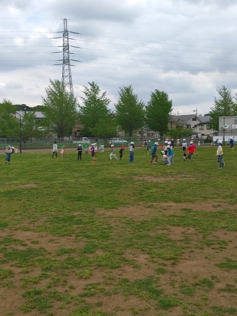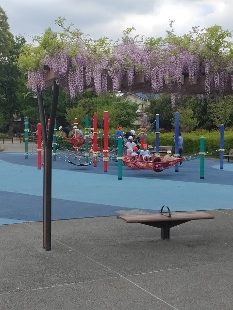 フジの花もきれいに咲いている中で、遊具を使った遊びや鬼ごっこなど笑顔いっぱいで楽しんでいます。近所の保育園や幼稚園の子供達もたくさん集まって遊んでいます。